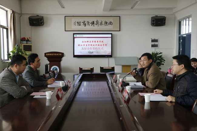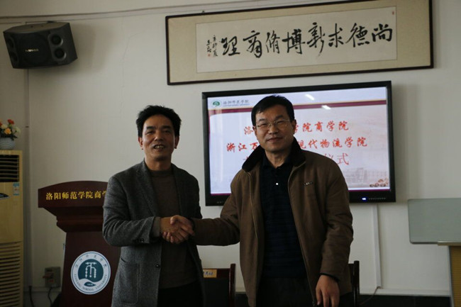 洛阳师范学院党委书记彭卫民代表商学院全体师生对远道而来的客人表示热烈的欢迎和衷心的感谢。商学院院长刘玉来向与会嘉宾介绍了商学院的发展历程、雄厚师资、科研成果,以及“双导师制”、“五个一工程”等办学特色,并着重介绍商学院的实践教学理念。商学院通过开展专业赛事、假期社会实践活动,企业家进课堂等活动提高学生的专业素养。同时,商学院与多家企业建立战略合作关系,打造专业平台,共同整合资源,实现互利共赢的目标。刘院长表示,当前学校正处于教学改革时期,商学院也在根据社会发展的需要、领导的指示及学生的期望进行不断探索,商学院希望通过与浙江万里学院现代物流学院的合作汲取经验,弥补不足,从而进行更多的指导性合作。