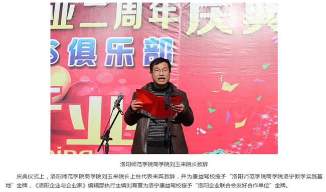 12月26日,康益驾校成立二周年庆典上,康益驾校被我校商学院授予为“洛阳师范学院商学院洛宁教学实践基地”。商学院院长刘玉来在庆典上代表来宾致辞,并为康益驾校颁发“洛阳师范学院商学院洛宁教学实践基地”金牌。许多媒体对相关的授予事项以及商学院院长刘玉来致辞发言等进行了报道。