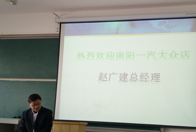 10月25日上午,我院邀请了南阳一汽大众店总经理赵广建为我院学生做了一个关于汽车销售实操技巧的专题讲座。参加本次讲座的有2014级市场营销班及2016级市场营销专升本班的全体同学。