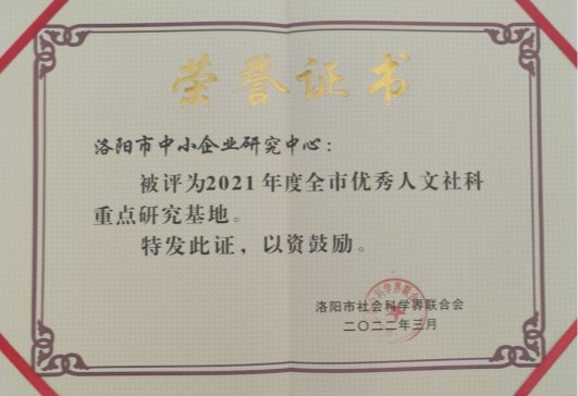 近日,洛阳市社科联召开四届五次全会,会上宣读了《关于2021年度全市社科系统先进单位和先进个人的通报》,我院市属人文社科重点研究基地“洛阳市中小企业研究中心”被评为2021年度全市优秀人文社科重点研究基地。
