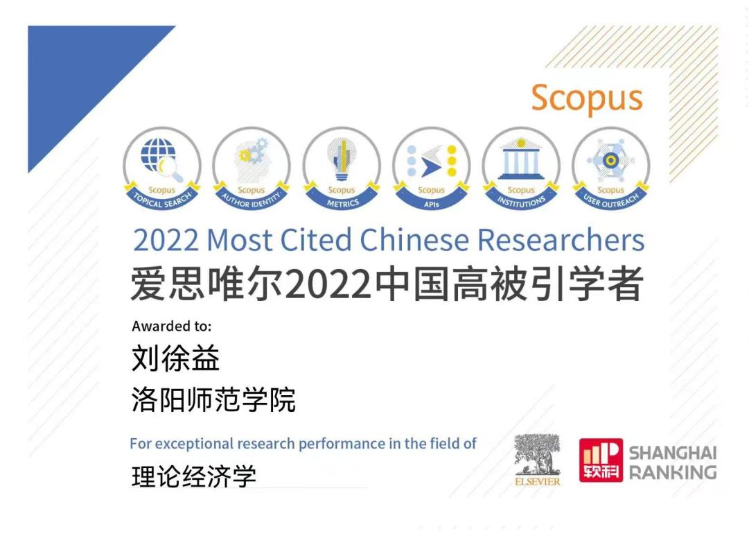 3月28日,全球领先的信息分析公司爱思唯尔正式发布2022“中国高被引学者年度榜单”。本次公布的“中国高被引学者”榜单,洛阳师范学院获评1人,我院刘徐益老师获评“爱思唯尔2022中国理论经济学高被引学者”。