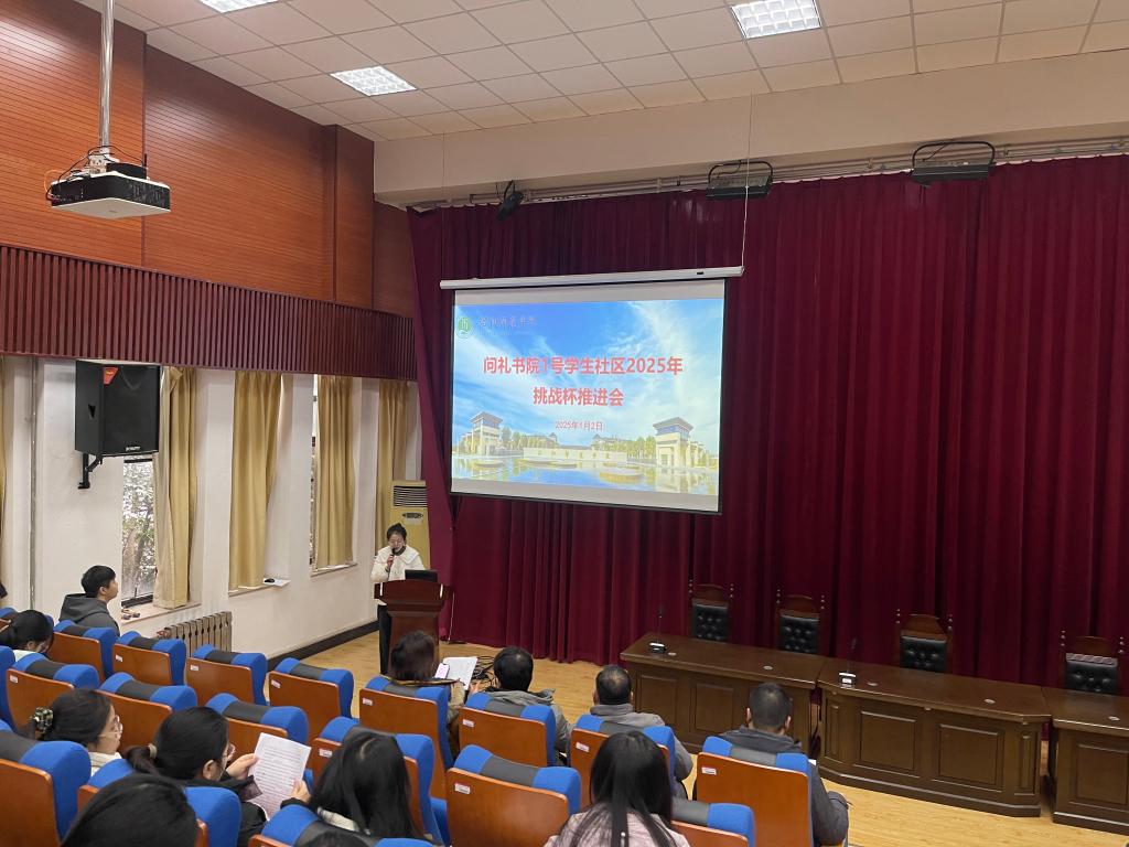 为切实做好2025年“挑战杯”项目选拔和培育工作,1月2日上午,问礼书院1号学生社区2025年“挑战杯”项目推进会在A3-202举行。问礼书院1号学生社区党委书记陈立栋、院长刘伟、党委副书记谭音,法学与社会学院院长秦永超、商学院院长张成玉等领导,以及各项目师生负责人等参加会议。