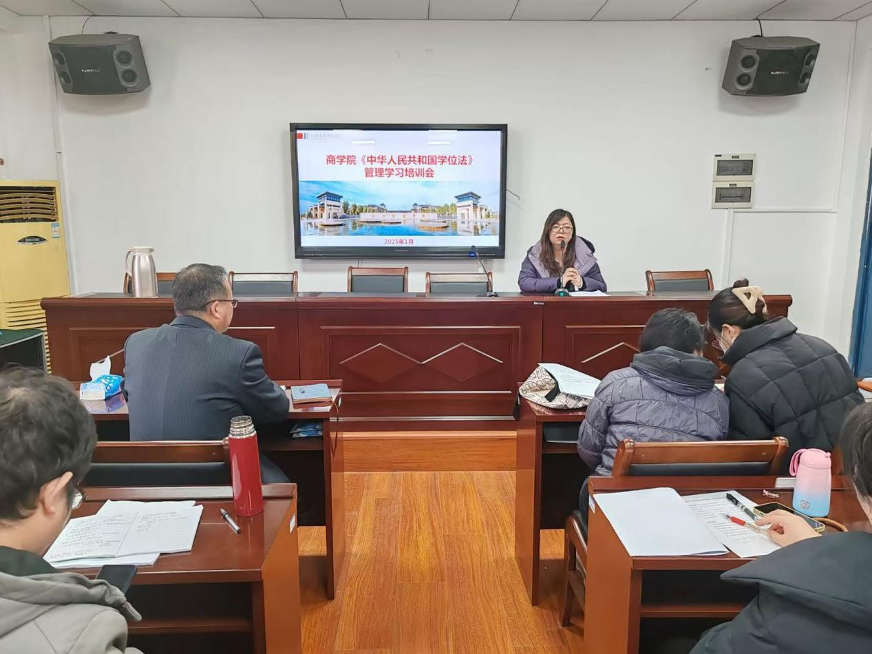 1月2日下午,商学院在A5-516召开“中华人民共和国学位法”专题学习会,本次会议由商学院副院长张舜主持,党委书记陈立栋、院长张成玉、党委副书记张瑞萍、副院长余江波以及商学院全体教师参会学习。此次学习会旨在加深教师对学位法的理解,确保学位授予工作的合法性和规范性。
