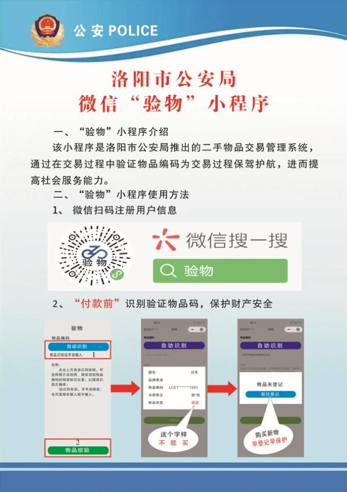 为有效防范、打击盗窃类违法犯罪,提升追赃挽损效率,按照洛阳市公安局“砺剑”系列行动部署,洛阳公安刑侦部门开发上线微信“验物”小程序。