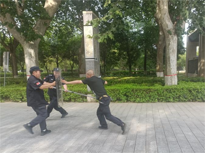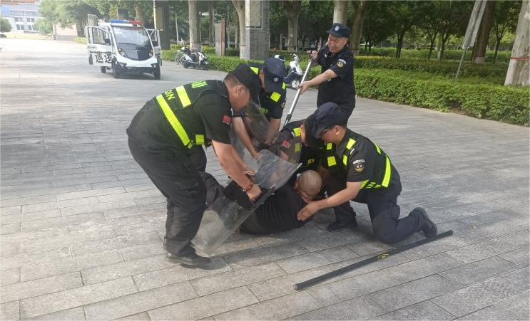 此次演练由学校友邻单位的一名工作人员模仿“不法分子”携带管制刀具企图闯入校园制造事端,我校值班保安队员发现后迅速启动应急预案,使用防暴盾牌、防暴叉等防暴器材进行制止,并使用电台呼叫机动队员前来支援,最终将“不法分子”捉拿“归案”。演练过程中,安保队员展现出应有的反恐防暴技能和战术素养,队员们紧密配合,迅速将“不法分子”制伏。