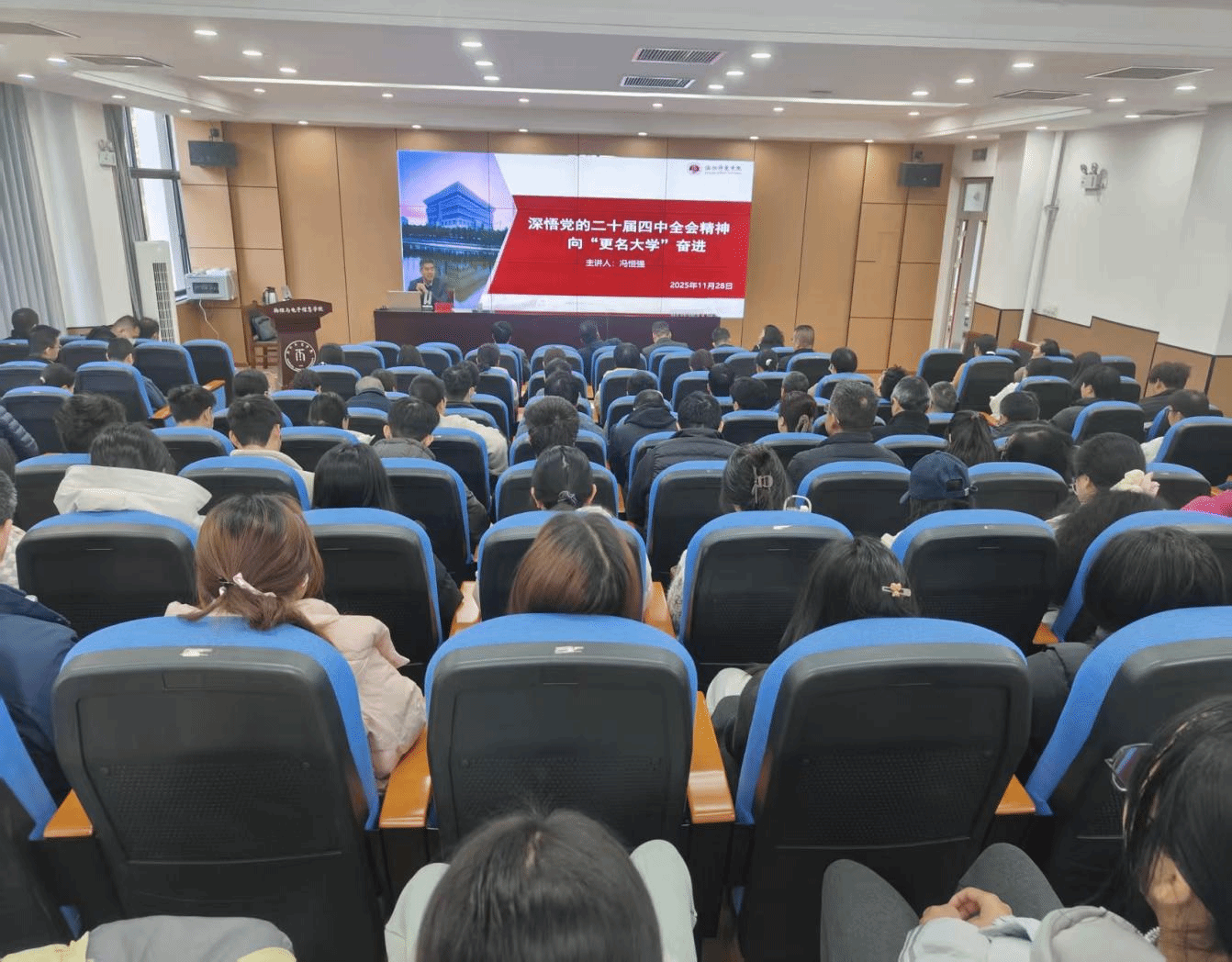 为深入学习贯彻党的二十届四中全会精神,11月28日上午,副校长冯恒强在物理楼102报告厅,为物理与电子信息学院和电气工程与自动化学院师生代表作专题宣讲报告。