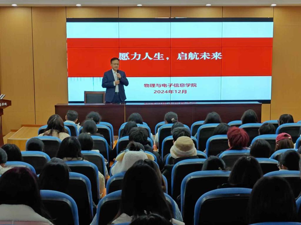 12月6日上午,由招生就业处主办,物理与电子信息学院、外国语学院和立雪书院联合承办的启梦大讲堂系列讲座之“愿力人生,启航未来”,在我院102报告厅举行。本次讲座由物理与电子信息学院2001届物理教育专业优秀校友、广东顺德天相电子科技有限公司创始人莫凡董事长担任主讲,物理与电子信息学院和外国语学院2025届毕业生参加了讲座。