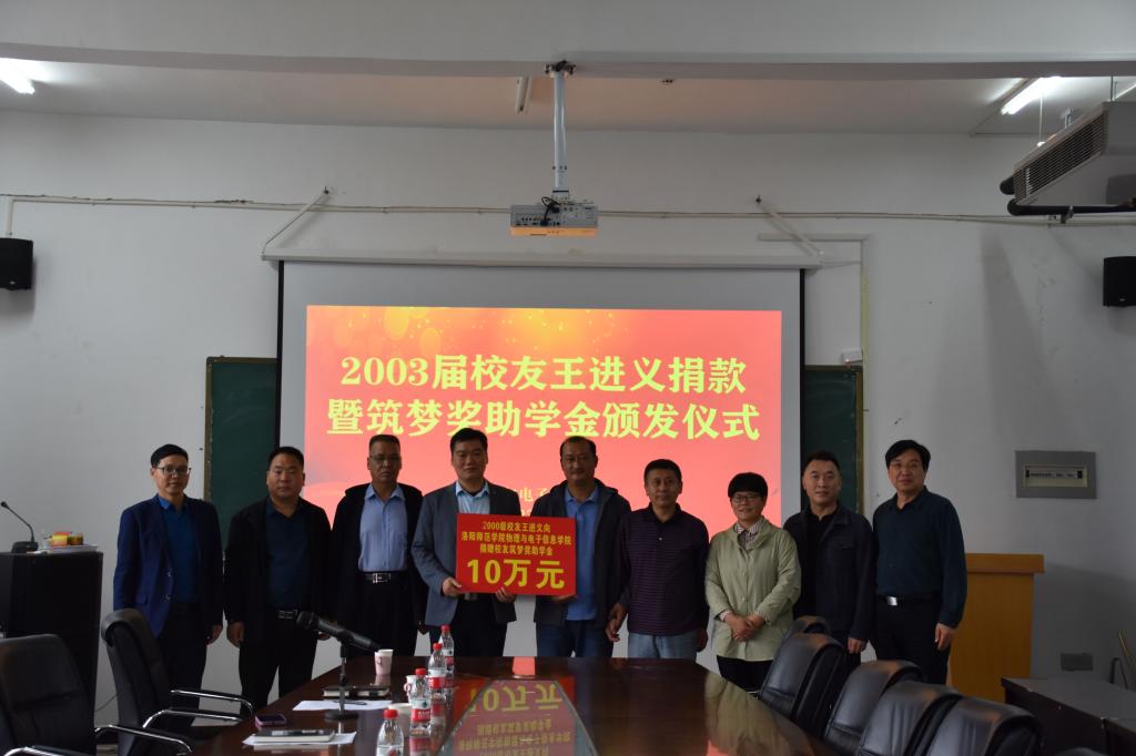 校友王进义在致辞中表达了对母校的感恩,并向大家分享了自己求学和创业的经历,勉励学弟学妹要树立远大理想,珍惜大学时光,踏实学习,学好知识学出能力;要勇于走出校园,多到国家一流大学看看,开阔视野,找到自己的不足和差距,刻苦钻研,真正成为对社会有用的人。希望通过此次捐赠活动,能够带动和影响更多的校友关心和支持母校事业发展,为建设母校美好未来贡献力量。并为10名在学习、服务、党员先锋等方面表现突出,品学兼优的学生颁发筑梦奖助学金。