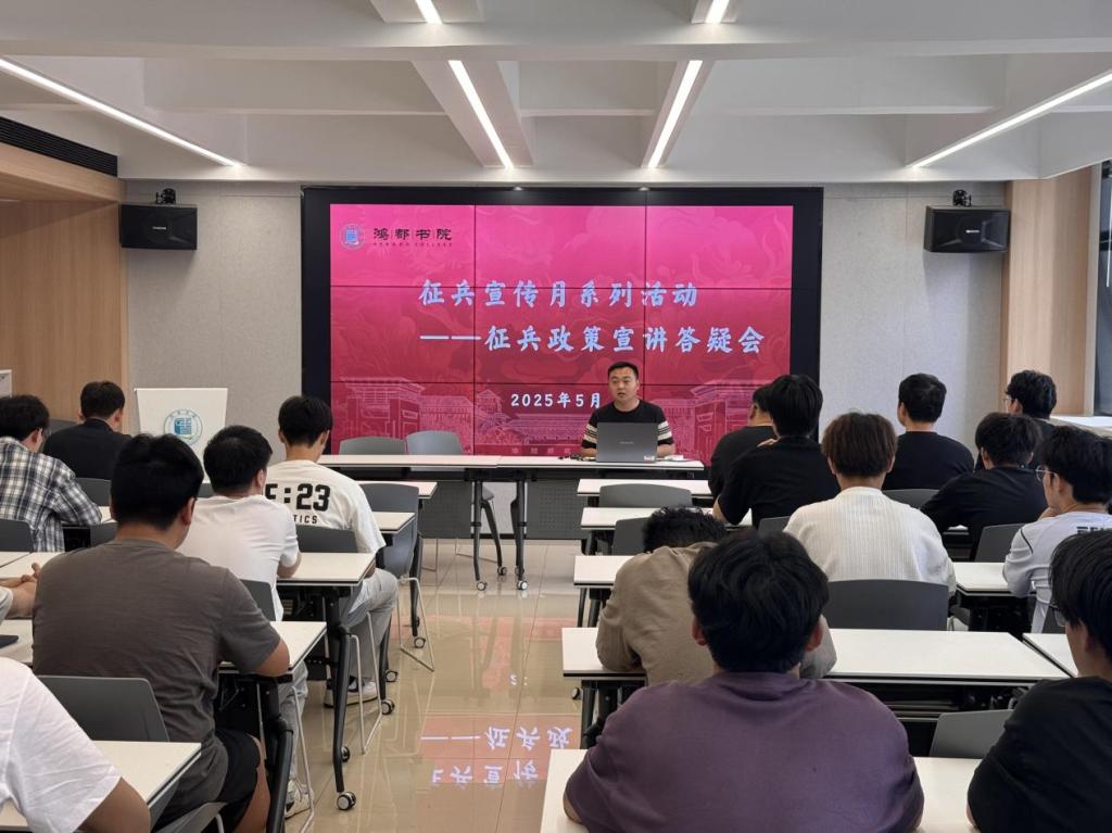 热血报国先明策,解锁军营新选择。书院组织召开了征兵政策宣讲答疑会,主讲老师王焱从入伍优待政策、参军入伍要求、应征入伍流程三个方面就征兵工作有关政策进行了宣讲,针对部分学生的视力矫正、体能训练、走兵时间等个性化问题做出了详细解答。他鼓励同学们积极携笔从戎、参军入伍,为中国梦、强军梦贡献自己的青春力量。