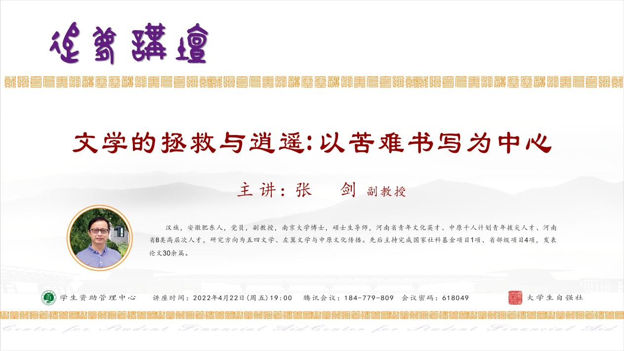 为助益广大受助学生人生出彩、梦想成真,由学生资助管理中心主办,大学生自强社承办的“追梦讲坛”于本周五晚上(4月22日)继续开展。本次讲座特别邀请文学院张剑副教授主讲《文学的拯救与救赎:以苦难书写为中心》。因疫情防控原因,本次讲座仍以线上方式进行,由学生资助管理中心姚怡斐老师主持。