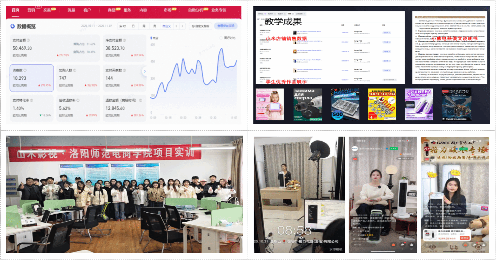 实训聚焦电商核心领域,各项目亮点纷呈。李宁鞋服项目深耕淘宝平台,学生全程参与全流程运营,累计吸引访客2.1万人次,销售额达10.74万元;桔叶项目完成多平台124家店铺布局,AI数据之家项目高效处理数据超19万条。跨境电商板块,俄区项目过品率33%,爆款转化领先行业均值;拉美项目完成1.76万个产品核价,斩获335笔订单,营收1.29万美元。此外,格力电器项目产出视频1000余条,单条最高播放量超30万,完成100余场直播,团队基础技能考核通过率90%;山木抖音本地生活项目开展193场直播,看播量29.74万,支付GMV达56.43万元。实训结束后,多名学生成功获得项目实习offer。