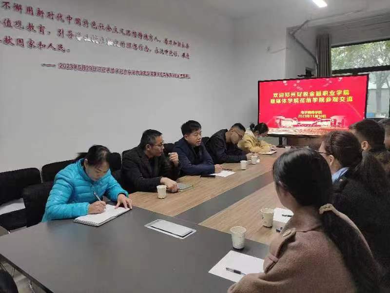 为增强校际间的交流合作,促进共同发展进步,进一步提升教学和就业质量,11月10日上午,郑州财税金融职业学院数媒产业学院院长王磊一行五人来我院进行交流学习,并在龙门书院3号院3131会议室举行了座谈会,学校招生就业处副处长张勇和学院党委副书记张荣光参加会议,会议由党委副书记张荣光主持。