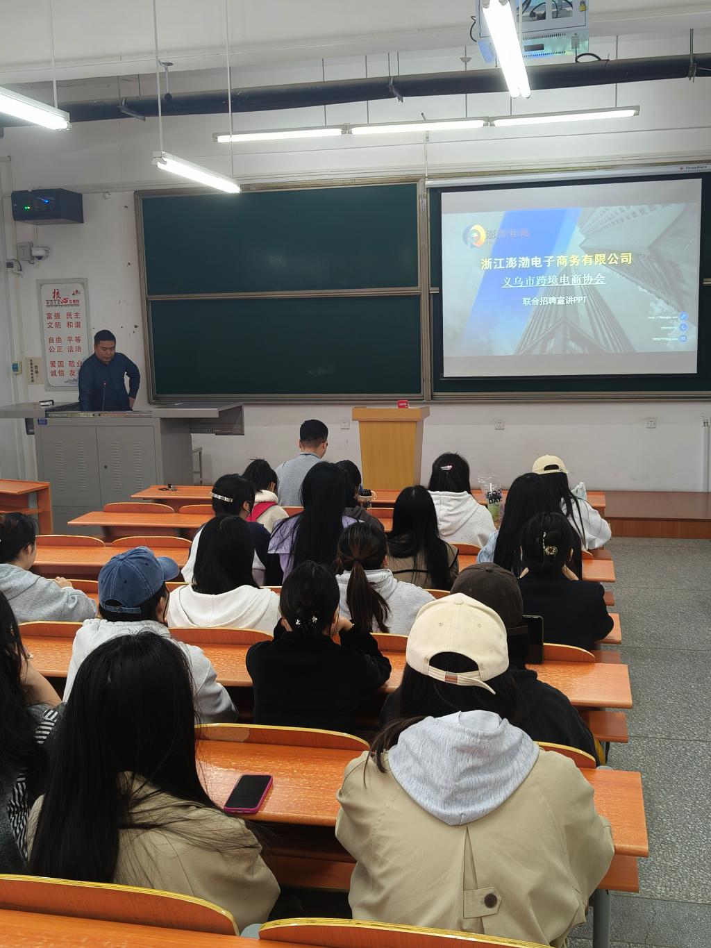 下午14:30浙江彭渤(义乌)电子商务有限公司在G4-106教室的开始招聘宣讲会。首先,公司总经理王景涛介绍了公司的企业文化、地理位置、薪酬待遇、晋升通道等方面情况;随后,23级专升本一班同学现场询问了岗位招聘条件,住宿等情况,现场气氛非常活跃,取得了较好的效果。