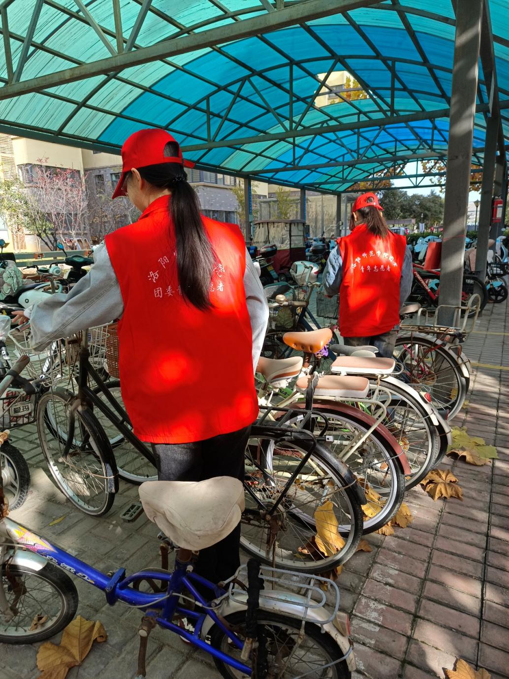 在负责人的带领下,将社区内停放不规范的的自行车、电动车摆放到合适位置,虽然天气寒冷,但大家劳动热情积极高涨。除此之外,学生还认真擦拭社区内公共活动器材,清扫落叶等活动。