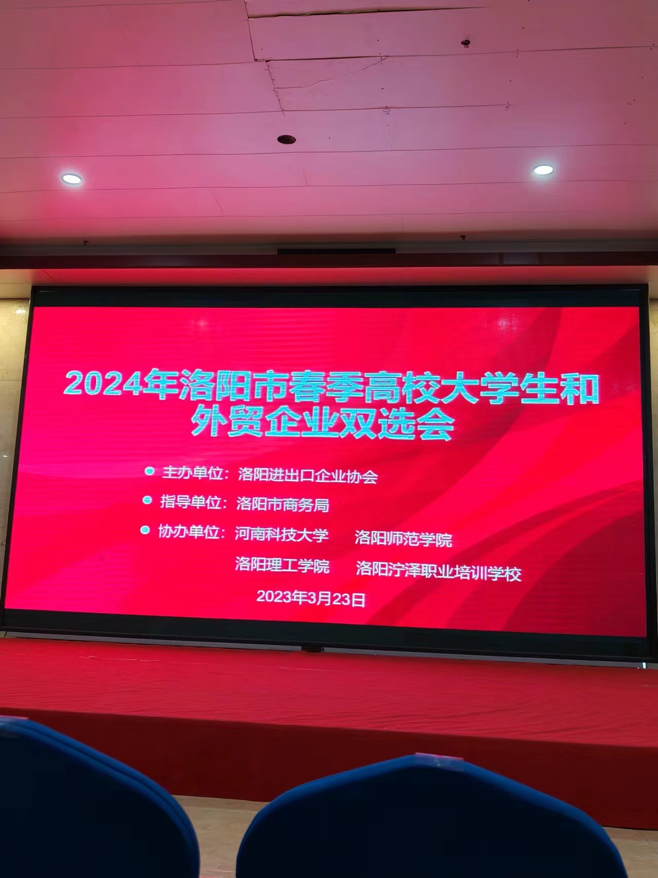 3月23日下午,由洛阳市商务局、洛阳市进出口企业协会联合几十家外贸企业,在政和大酒店四楼会议室举行《2024年洛阳市春季高校大学生和外贸企业双选会》,河南科技大学、洛阳师范学院、洛阳理工学院、洛阳泞泽职业培训学校四所高校300余名学生参加此次双选会,会议由商务局相关科室领导主持,他对外贸企业为洛阳市的经济做出的贡献表示感谢,并对参会的外贸企业表示衷心的欢迎;某外贸企业董事长高留斌先生致词。