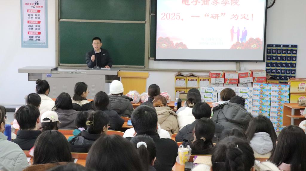2025年硕士研究生考试临近,考研学子进入紧张冲刺阶段。为减轻学子压力、坚定信念,我院于2024年12月17日在考研自习室G4-507举办“考研送温暖”慰问活动。学校财务处处长黄群立,副处长付强、卢爽和学院领导班子成员与考研学生代表齐聚一堂,为考研学子加油鼓劲。