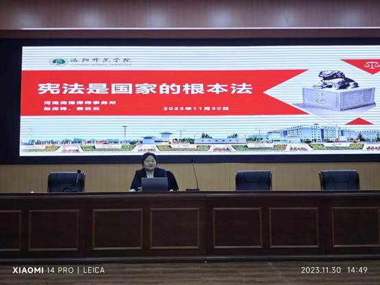 11月30日下午,法治宣讲活动在G1-112教室召开,娄云云律师作了题为“宪法是国家的根本大法”的专题汇报演讲。洛阳师范学院学院法律事务中心中心负责人及300余名学生参加了本次法治宣讲活动。宣讲活动由法律事务中心副主任徐业尧主持。