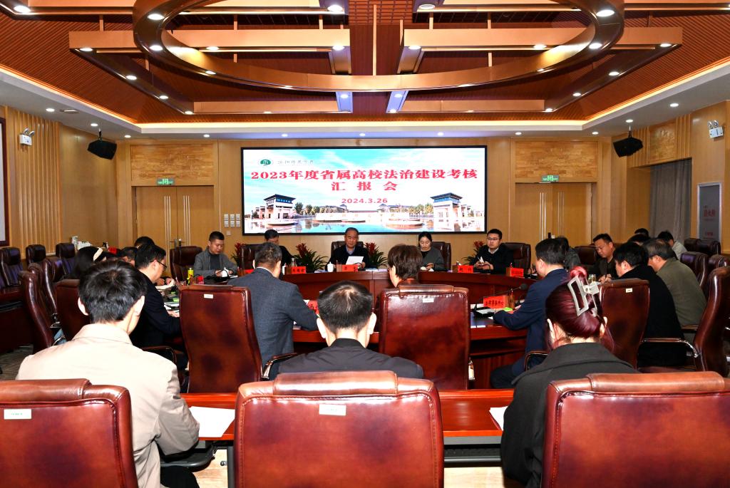 3月26日下午,以河南科技职业大学党委书记苏宇为组长的省属高校法治建设工作考核组一行到我校开展2023年度法治建设考核工作。考核汇报会在成均楼B301会议室召开。校党委书记郭改英、副校长冯恒强参加汇报会。