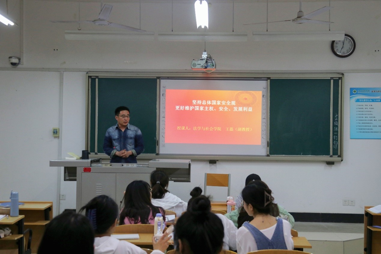 会上,王磊通过介绍当前国际大环境和近年来的国际热点事件,引出我国国家安全形势严峻、任务繁重,以及维护好国家安全的重要性。通过引用习近平总书记的重要讲话精神来解释国家安全是社会发展的前提,只有我们拥有和平、稳定、安宁的国际环境,才有可能实现中华民族的伟大复兴。王磊结合自身经历对我国的信息安全、海洋安全、社会安全等领域进行重点讲授,帮助同学们提高认识,提升对国家安全的重视程度。最后,王磊强调我国坚持总体国家安全观和人类命运共同体,代表着全人类爱好和平和发展的愿望,当今中国要居安思危,增强忧患意识,加强对国际法的应用,维护以联合国为核心的国际体系建设和以国际法为基础的国际秩序,切实维护好我国国家安全,更好应对全球挑战。
