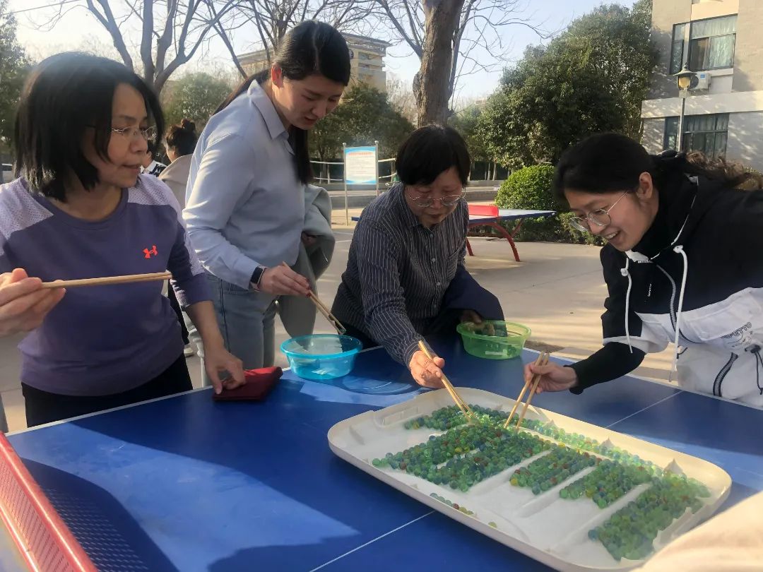 在负责活动的体育老师的组织下,我院女老师们来到现场后首先进行了推铁环接力赛的项目,活动虽然需要一定的技巧,但通过老师之间的团结协作,两组参赛队员还是发挥出了较高水平,场上不时传来铁圈滚动时发出的哗啷音和老师们爽朗的笑声,气氛十分活跃。第二项是同心鼓接球活动,在此环节中,老师们默契配合,同心一致,根据球的运动走向及时调整力度和行进方向。随着比赛渐入佳境,老师们即使不慎落球,也能尽快找到颠球节奏。在最后一项“颗粒归仓”活动中,老师们的热情仍旧没有消散半分,她们全神贯注,聚精会神,往小盆里不断放进夹起的弹珠,沉浸在这项充满趣味的活动中。