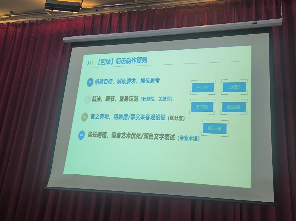 刘奎汝从明确求职目标、获取就业信息、求职简历准备与投递三方面展开讲述。她建议同学们要先通过社会环境分析、职业探索、自我探索、家人建议等途径深入了解自己的求职需求与毕业去向,并向同学们推荐了多个招聘网站和就业信息获取渠道,通过分析每种信息渠道的优缺点,提醒同学们学会分辨信息真伪,分清主次轻重,科学安全求职。随后,刘奎汝重点围绕简历的重要性和简历的制作技巧进行讲解,从个人信息、教育背景、工作经历、技能和特长等方面详细介绍了简历的基本结构和内容。她强调,简历应当明确目标、重点突出、以岗定需、言之有物、扬长避短,切实突出自身专业技能和亮点,并通过对大量“反面”简历进行优化来帮助同学们更好地掌握制作简历的要领。最后,刘奎汝老师积极与同学们进行互动,共同找出所展示的简历中存在的问题,并提出相关修改意见和建议,同学们纷纷表示获益匪浅。