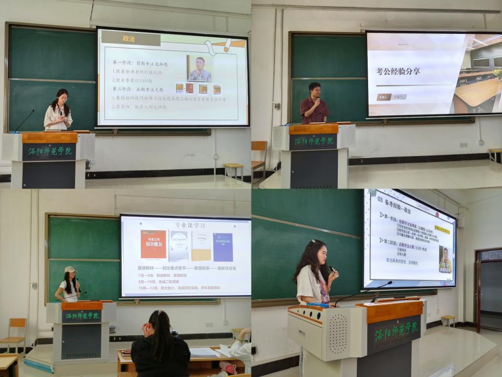 交流会上,学长学姐们基于个人学习经历,进行了深入浅出的讲解,为在座学生提供了可借鉴的学习方法。潘佳莉系统整理了从考试大纲发布至初试成绩揭晓的关键时间节点,助力同学们构建明确时间规划框架;侯梦如与刘舒畅针对院校选择问题提出建议,强调必须综合考量复试分数线、招生名额等要素,做出明智决策;在英语备考方面,孔杰与刘丽萍一致认为,加强词汇记忆与不断进行题目练习是提高分数的关键途径;刘雨利悉心分享了关于考研资料的搜集途径与获取渠道;秦铭良在专业课备考方面指出,搭建知识结构是首要任务,接着需投入大量时间记忆,并密切关注时政动态,加强模拟训练,提高应试技巧;靳蕾着重分享复试环节,提醒大家关注社会工作的时政信息,同时重视专业实习及参与的竞赛活动;张鹏飞分享了备考公务员时如何挑选优质在线课程资源以及如何安排答题顺序,鼓励同学们在做出选择后勇往直前。