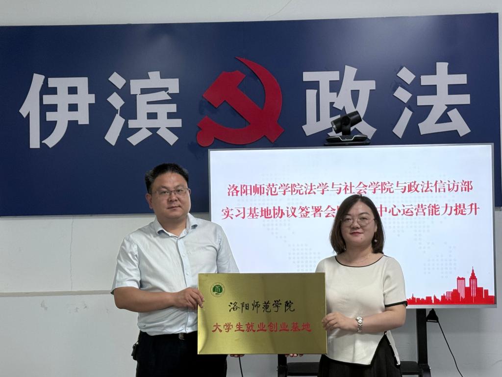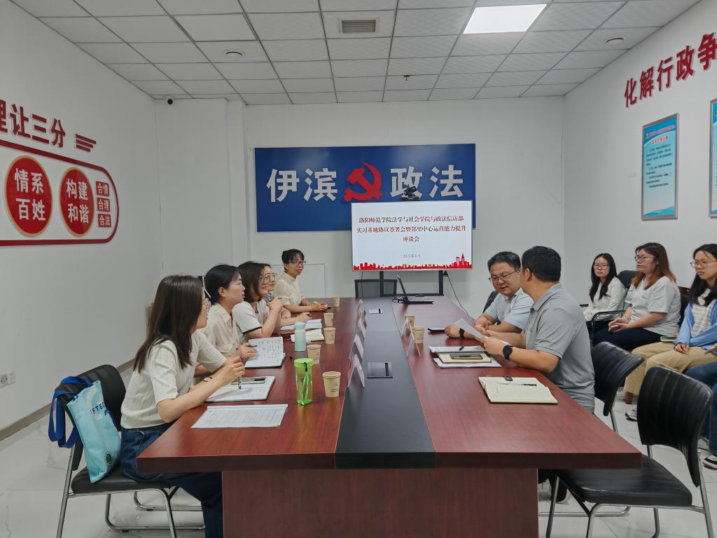 在中共洛阳市城乡一体化示范工委政法信访部,部长胡鑫磊、副部长张海涛、办公室副主任陈爽等接待了我院一行人员。座谈会上,双方聚焦专业社工与志愿服务的融合、做实网格化管理、党建引领新兴领域参与基层治理等方面进行了深入交流。安连朋表示,学院始终以培养具有社会责任感和专业素养的复合型人才为目标,希望通过与政法信访部门的合作,帮助学生更精准地把握社会需求,提升实践操作能力,也为基层治理提供切实可行的方案建议。胡鑫磊指出,希望通过与洛阳师范学院的紧密合作,为全区邻里中心运营和基层治理工作提供有力的智力支持和人才保障,并在邻里中心运营、网格管理、基层社区队伍建设等方面实现新突破。座谈会后,双方举行了专业实习基地合作协议和就业创业基地建设协议签约仪式。