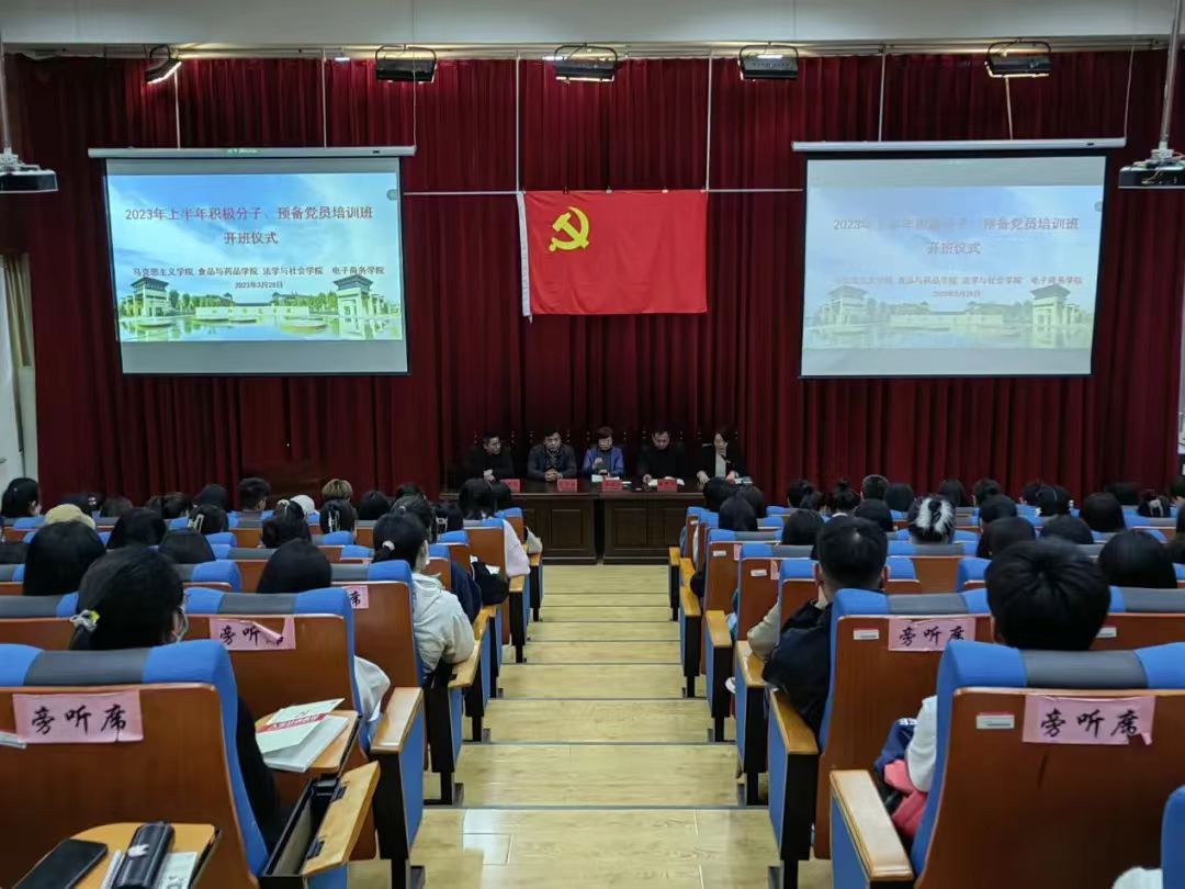 为进一步推动党员队伍建设,切实做好入党积极分子和预备党员的培训工作,3月28日晚,我院党委与电子商务学院党委、食品与药品学院党委、马克思主义学院党委在校园法庭联合举行2023年上半年入党积极分子、预备党员党课培训班开班仪式暨第一次党课培训。电子商务学院党委副书记张荣光、食品与药品学院党委书记陈贯安、马克思主义学院党委书记朱胜利、我院党委书记张姣云与党委副书记谭音出席仪式,四院入党积极分子和预备党员共181人,以线下线上的形式参加培训。仪式由我院党委副书记谭音主持。