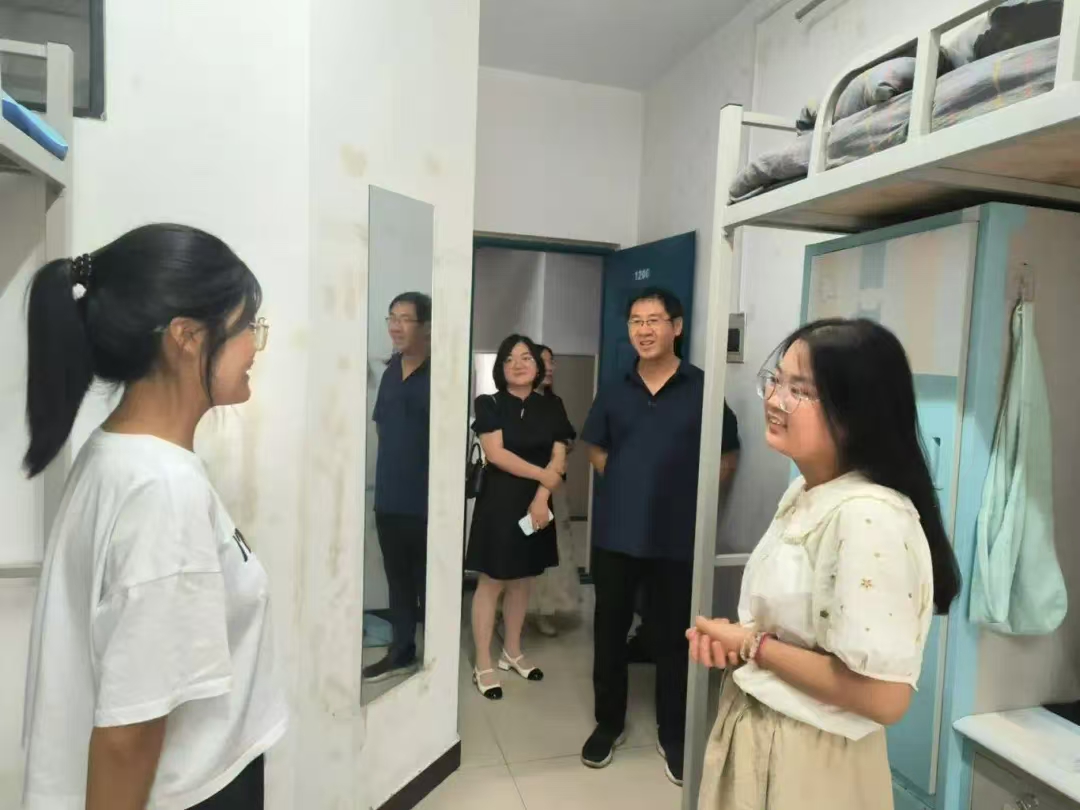 走访新生宿舍过程中,党委书记刘伟亲切询问大家的家乡籍贯、校园初印象、入学适应等情况,表达了学院对同学们的深切关怀,勉励同学们珍惜青春时光,练就过硬本领,努力提高综合素养,全面成长成才。院长秦永超殷切希望同学们尽快融入大学生活,做好学业规划和生涯规划,多阅读经典书籍,不断提升专业素养与核心竞争力。党委副书记谭音叮嘱同学们,要严格遵守宿舍安全规定,提升安全意识,重视安全防护,加强体育锻炼,保持阳光、积极、乐观向上的心态,以崭新饱满的精神面貌迎接大学生活。育人导师们贴心叮嘱同学们自觉遵守学校规定,做好宿舍卫生保洁,养成良好的学习生活习惯,共同营造安全、舒适、温馨的宿舍环境。随后,领导班子一行还深入到老生宿舍与同学们展开了亲切交流。