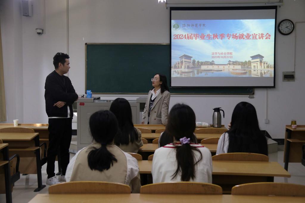 双选会现场,秩序井然,人头攒动,氛围热烈,我院学生积极主动就企业文化、薪资待遇、组织架构等方面与招聘企业展开交流。招聘人员认真解答同学们的疑问,真诚邀请应聘者加入。下午,我院召开2024届毕业生秋季专场就业宣讲会,邀请了和勤盛法律咨询服务团队来到A3-113教室进行宣讲。会前,褚畅老师与企业负责人就业务范围、未来发展方向等方面进行交谈。会上,负责人向同学们介绍了团队优势、职位需求,并就毕业生就业现状与同学们展开了深入的交流。