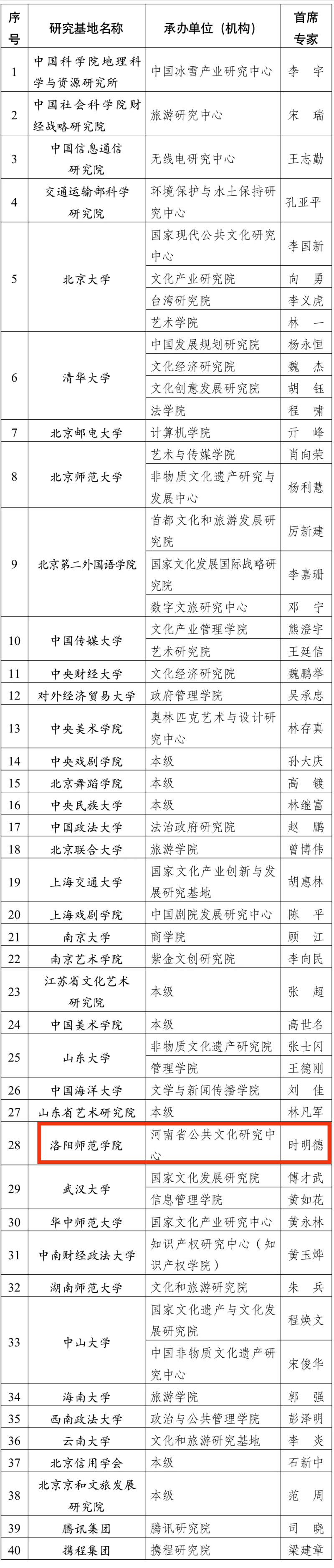 近日,文化和旅游部下发通知(文旅政法发〔2023〕57号),公布“文化和旅游研究基地(2023—2025年)”名单,中国科学院地理科学与资源研究所、北京大学、清华大学等40家单位获批设立,我校位列其中,是河南省唯一入选单位。研究基地由我校河南省公共文化研究中心作为承办单位,时明德教授担任首席专家。