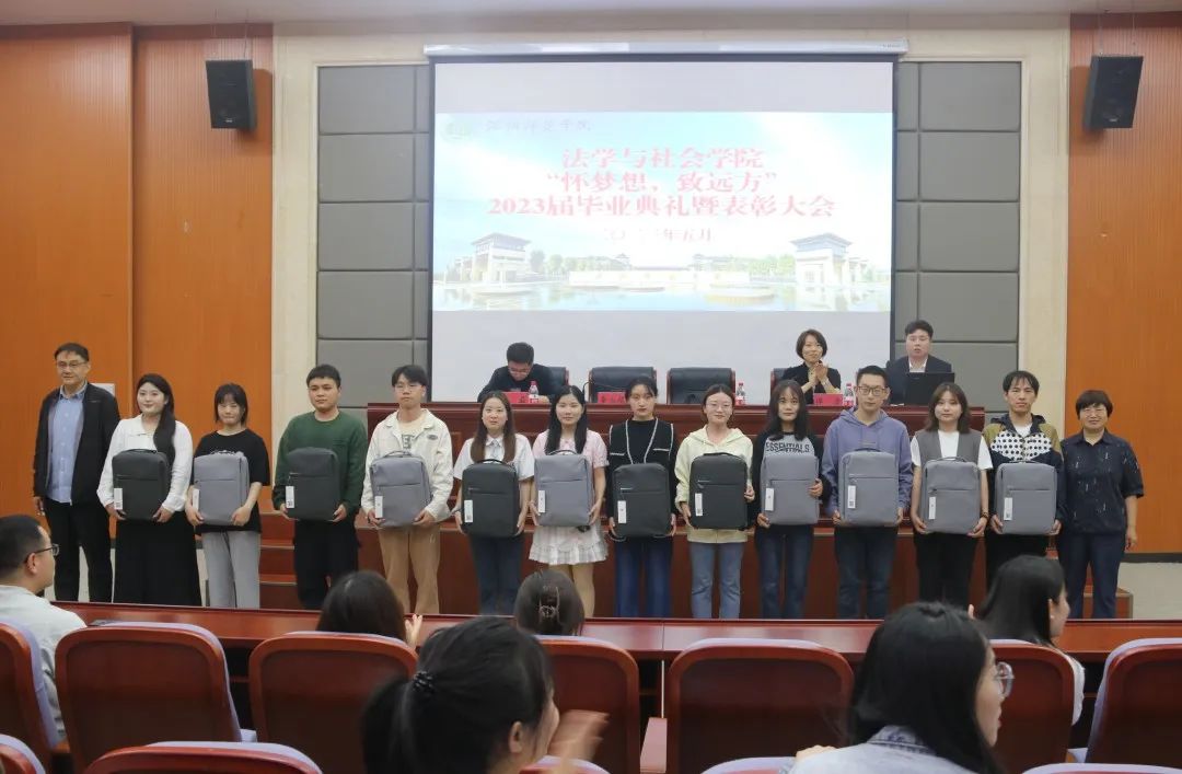 典礼正式开始前,同学们在毕业留言板上留下对未来的美好祝愿并观看毕业视频,重温难忘的青春记忆。毕业典礼在嘹亮的国歌声中拉开帷幕,党委书记张姣云宣读对2023届毕业生“考研先进个人”、“就业创业先进个人”的表彰决定,学院领导为受表彰的个人进行了颁奖。优秀毕业生代表李梓萌、王明阳依次发言,回忆了在洛师生活中的点滴,表达了对学院教师传道授业解惑的感谢,她们表示一定会铭记“敬业奉献、为人师表”的校训,不懈奋斗,砥砺前行。2020级学生代表杨梦瑶衷心祝愿学长学姐们此后路途坦荡,初心不忘,筑梦远航,并表示定会向学长学姐们学习,铭记使命、不懈奋斗,成为更优秀的法社学子。教师代表韩颖娟教导毕业生们要博学慎思、放下包袱、勇敢尝试,希望同学们可以求知向上,在人生路途中扬帆远航。