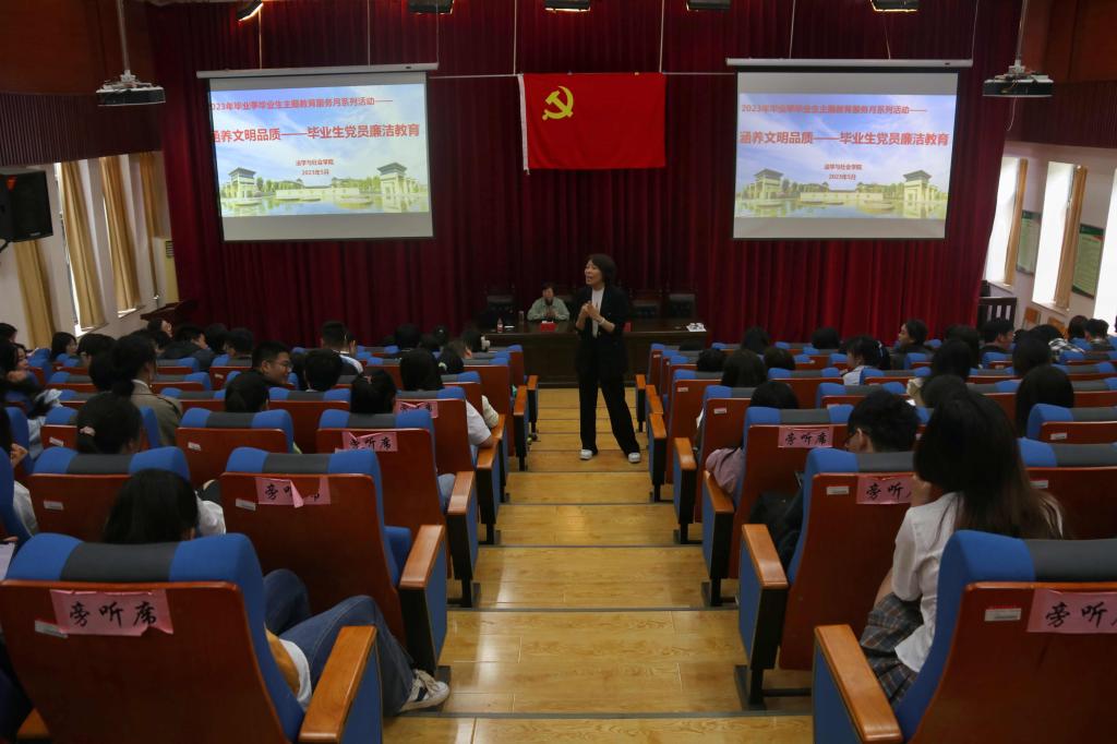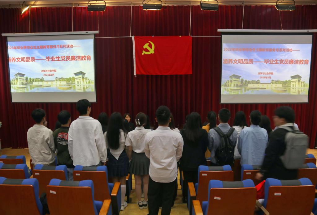 为进一步增强毕业生党员党性意识和组织观念,推动毕业生党员在学思践悟中坚定理想信念,引导毕业生党员扣好廉洁从业第一粒扣子,更好地发挥毕业生党员的先锋模范作用,5月10日上午,我院于A3-202校园法庭举行了2023届毕业生党员廉洁教育党课,我院党委书记张姣云、党委副书记谭音担任主讲人,2023届部分毕业生到场聆听。