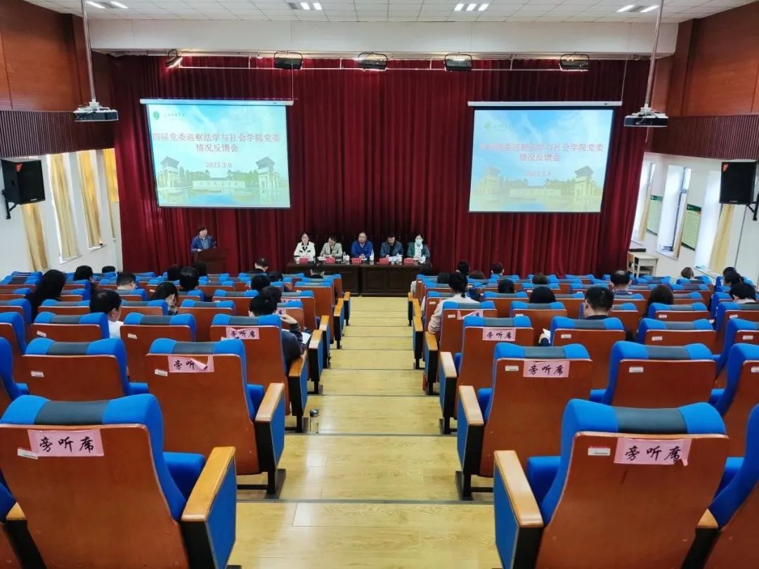 3月9日下午,我院于A3-202校园法庭召开四届党委巡察法学与社会学院党委工作情况反馈会。校党委副书记、工会主席李晓彦、党委第一巡察组组长丁进、副组长蔡云改、巡察干部常洁琼、我院领导班子和全体教职工参加会议,会议由校纪委副书记、党委巡察工作办公室主任杨会宾主持。