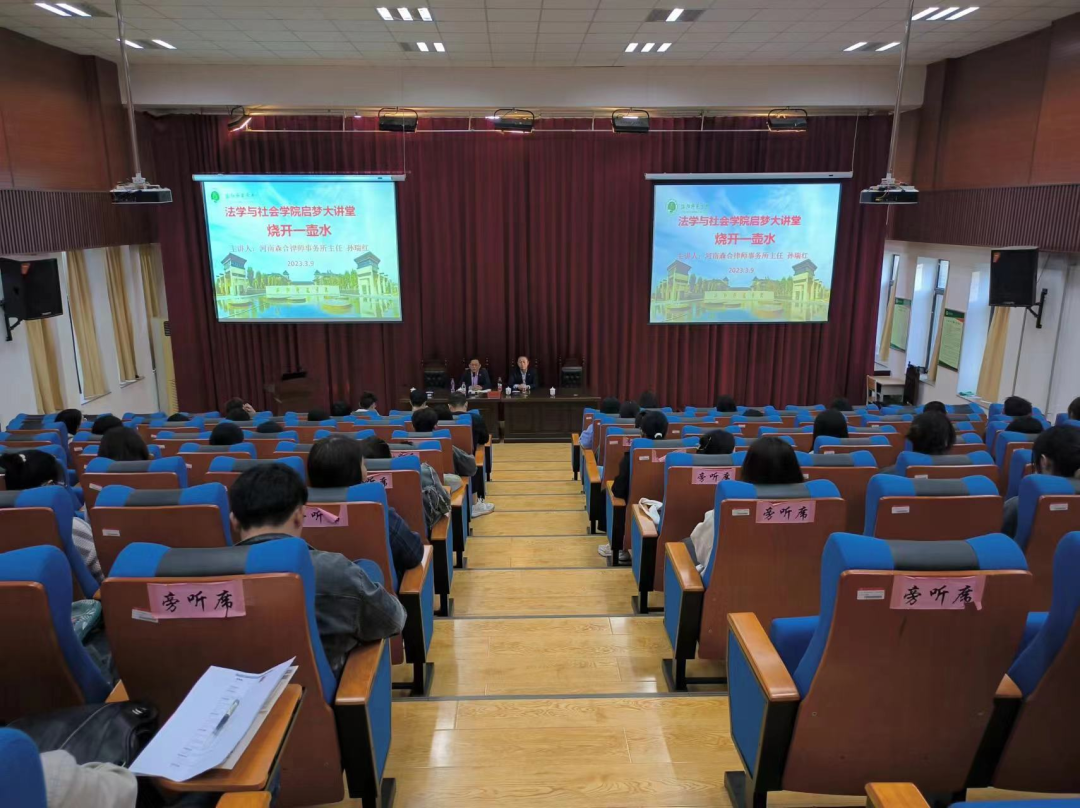 3月9日下午,由招生就业处主办,法学与社会学院承办的启梦大讲堂系列讲座之“烧开一壶水”在A3-202校园法庭举行。本次讲座由法学与社会学院2002级毕业生、河南森合律师事务所主任、河南省律师协会刑事专业委员会执行委员孙瑞红担任主讲人,法学与社会学院党委副书记谭音、辅导员褚畅出席会议,法学与社会学院学生代表到场聆听。