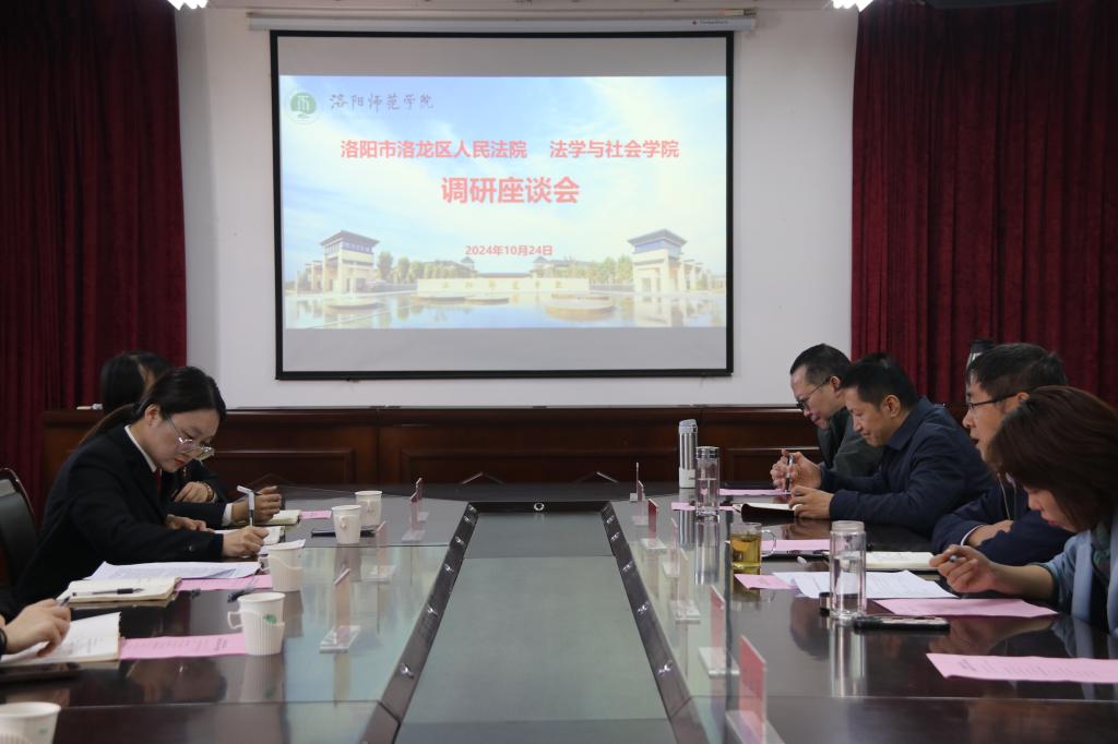 为进一步推动法学教育与司法实务紧密衔接,提高法学专业建设质量和人才培养质量,10月24日上午,洛阳市洛龙区人民法院党组成员、副院长董曾曾一行莅临我院调研座谈。我院领导班子成员和教师代表热情接待并陪同座谈交流。座谈会在A3-428会议室进行,党委副书记谭音主持会议。