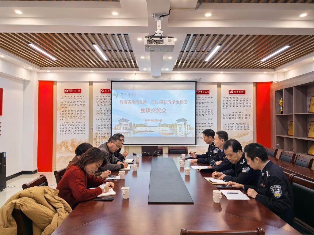 为积极探索教育改造新模式,加强高校与监狱系统的合作,2月26日下午,河南省第四监狱党委委员、副监狱长李利军一行4人来到问礼书院一号学生社区,开展监校合作交流座谈。双方围绕“教育赋能、文化育人”主题,就如何借助高校资源推动监狱教育改造工作,进行了深入探讨。