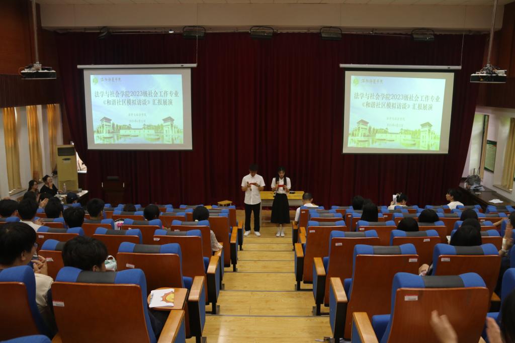 为深化专业知识交流,推动理论与实践深度融合,6月12日下午,我院2023级社会工作专业班学生在A3-202模拟法庭举行《和谐社区模拟访谈》汇报展演。院长秦永超、党委副书记谭音和韩颖娟、张小莉等教师代表出席活动,2024级社会工作专业班学生到场观摩。