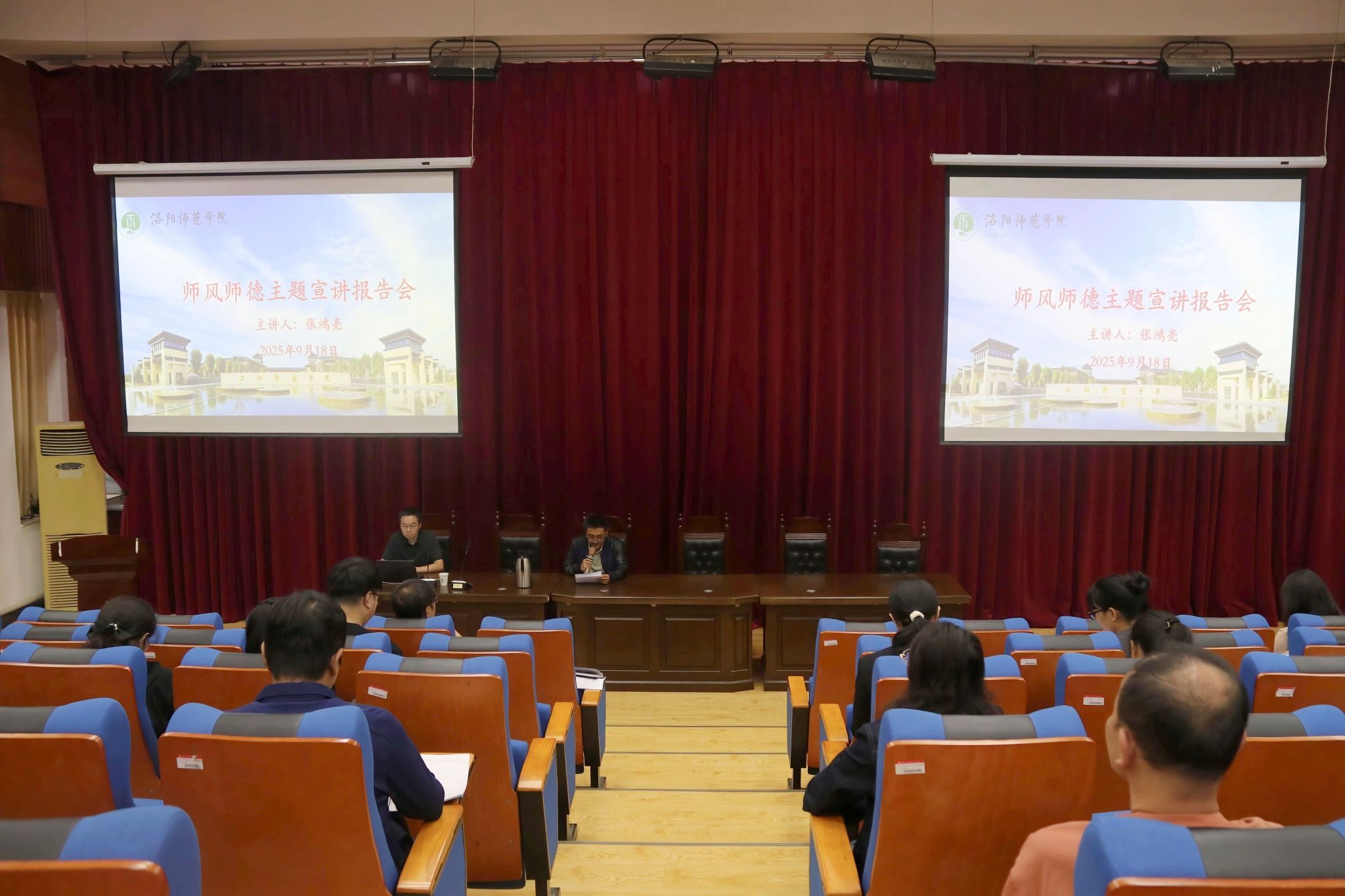 为进一步强化教师师德师风意识,加强师德师风教育,9月18日下午,我院在A3-202召开师德师风主题宣讲报告会,特邀历史文化学院副院长张鸿亮担任主讲人。我院领导班子成员和全体教师参加报告会,副院长聂飞主持报告会。