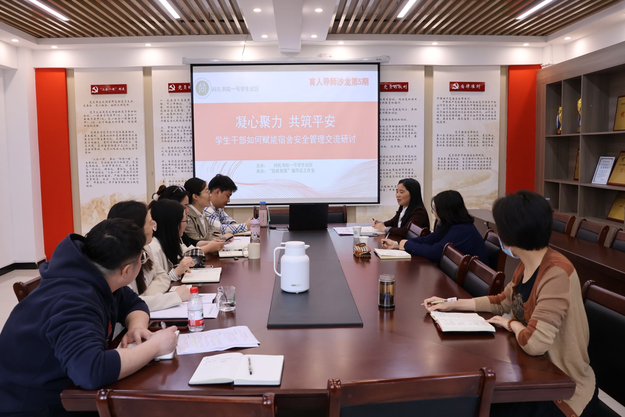 为筑牢学生宿舍安全防线,发挥学生干部在宿舍安全管理中的先锋作用,4月14日下午,问礼书院一号学生社区在党团活动室举办2026年育人导师沙龙(第5期)暨学生干部赋能宿舍安全管理交流研讨会。社区全体班子成员、育人导师(辅导员)及工作室成员参加。
