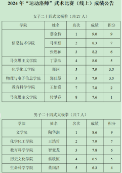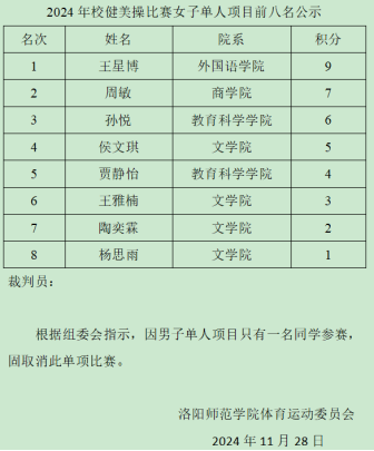 2024年“运动洛师”校园健美操大赛分为线上单人项目和线下集体项目。单人项目中,女子单人操的前三名成绩如下: