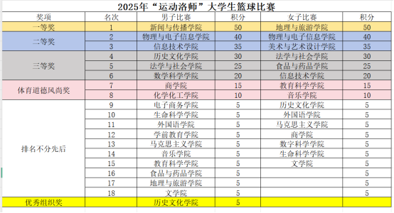三等奖:男子组数学科学学院、法学与社会学院、历史文化学院;女子组信息技术学院、食品与药品学院、法学与社会学院;