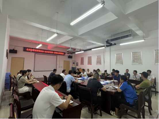 赵明主任对新学期各项工作进行了部署,强调本学期的重点工作是本科教育教学审核评估工作,要求全体教师统一思想,全力以赴做好部门的迎评工作。阴腾龙副主任对部门暑期迎评工作开展情况进行了说明,对期初迎评材料准备工作和教学工作提出了要求。