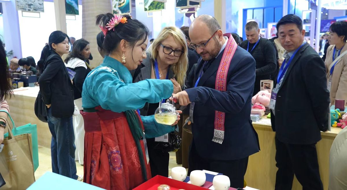 文创精品展区,众多“豫”字精品非遗文创产品大放异彩,备受瞩目。洛阳牡丹花茶,以其馥郁芬芳之气令人陶醉;金丝楠木上精雕细琢的山水、花鸟、人物等吉祥图案,尽显匠心独运;钧瓷的古朴韵味与人工钻石的璀璨夺目,共同诠释了传统与现代交融的文创之美。这些作品与来自全国各地的文创精品同台媲美,各类新颖独特的文创产品备受追捧。通过文创产品交流,增加文化和旅游产品附加值,激活旅游文创市场,服务文化和旅游业高质量发展。