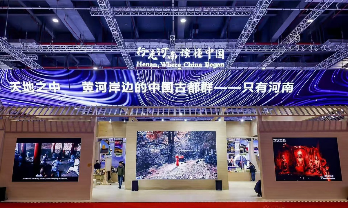 本届旅交会,河南展区占地300平方米,以“黄河古都”和“鼎立中原”为创意思路,结合高清LED数字屏和现代声光电效果,突出展现河南文化旅游新形象,吸引了大批国内外参展客商驻足关注。
