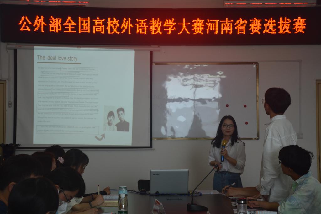 5月20日下午,公外部在敦行楼411会议室举行了全国高校外语教学大赛河南省赛选拔赛。本次比赛邀请教师发展中心孟宪乐教授、外国语学院商艳芝教授、公外部王莹主任以及陈占岐老师、陈杰老师、张小芳老师、赵乐芳老师担任评委,公外部全体教师参加了本次教学观摩活动。