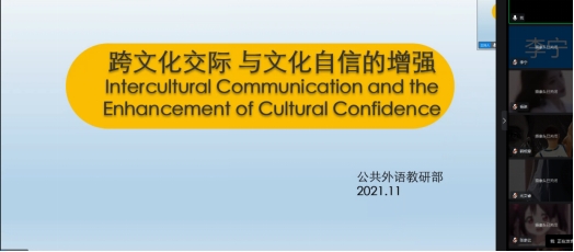 2021年11月18日下午公共外语教研部通过线上“钉钉会议”为2021级新生开展了题为“跨文化交际与文化自信的增强”的学术报告。