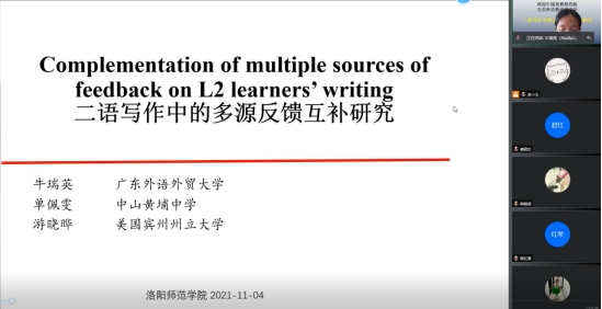11月4日下午,公共外语教研部邀请广东外语外贸大学牛瑞英教授通过“腾讯会议”开展了题为“二语写作中的多源反馈互补研究”学术讲座,公外部全体教师参加了此次讲座。