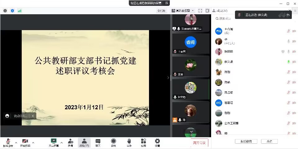 1月12日上午,公外部党支部在线上召开 2022年度党支部书记抓基层党建工作述职评议考核会议。公共教研部党委书记赵文艳同志主持会议,公外部全体党员以及民主党派代表、群众代表共37人参加会议。