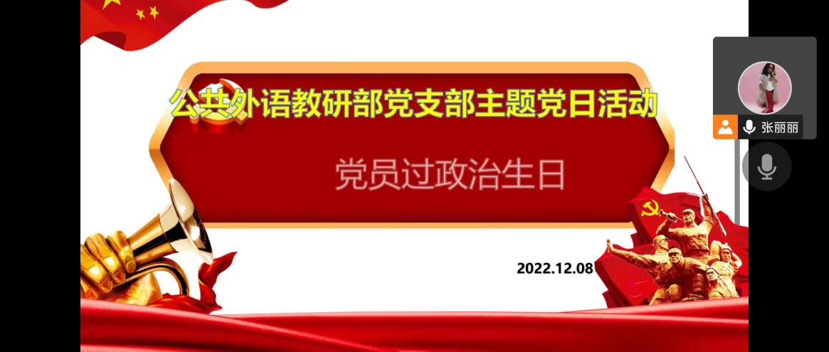 2022年12月8日,公共外语教研部党支部在线上举行“党员过政治生日”主题党日活动,支部书记张丽丽主持会议,全体党员参加本次活动。